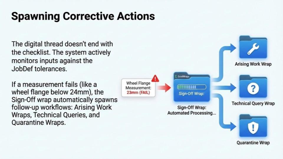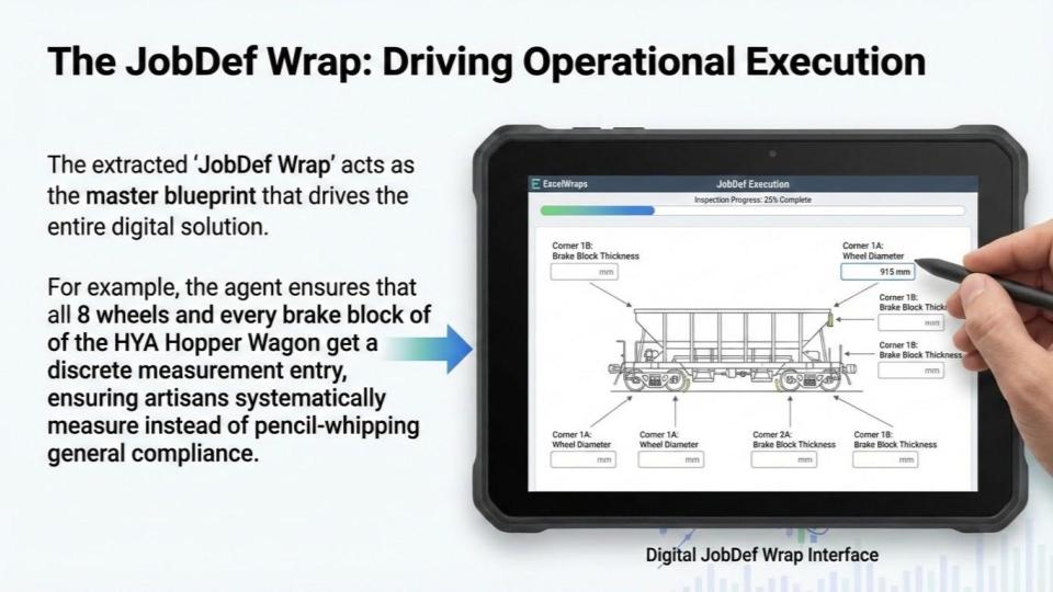 The Spec to JobDef AI agent automates the translation of complex, unstructured maintenance manuals (like PDFs) into highly structured, machine-readable datasets called "JobDefs." These JobDefs then act as the digital blueprint to drive step-by-step artisan execution, compliance tracking, and automated fault resolution within the ExcelWraps system.